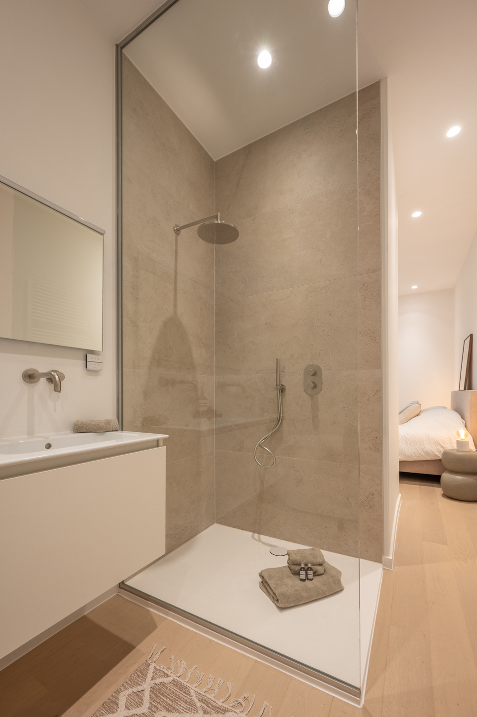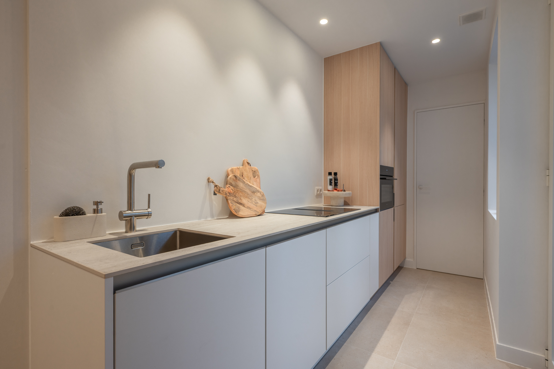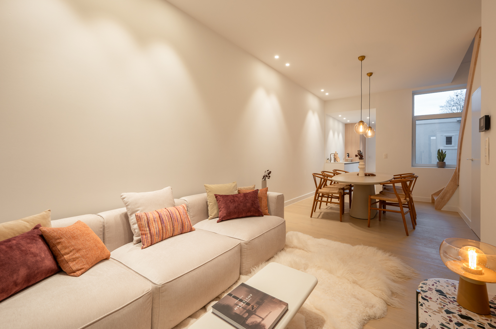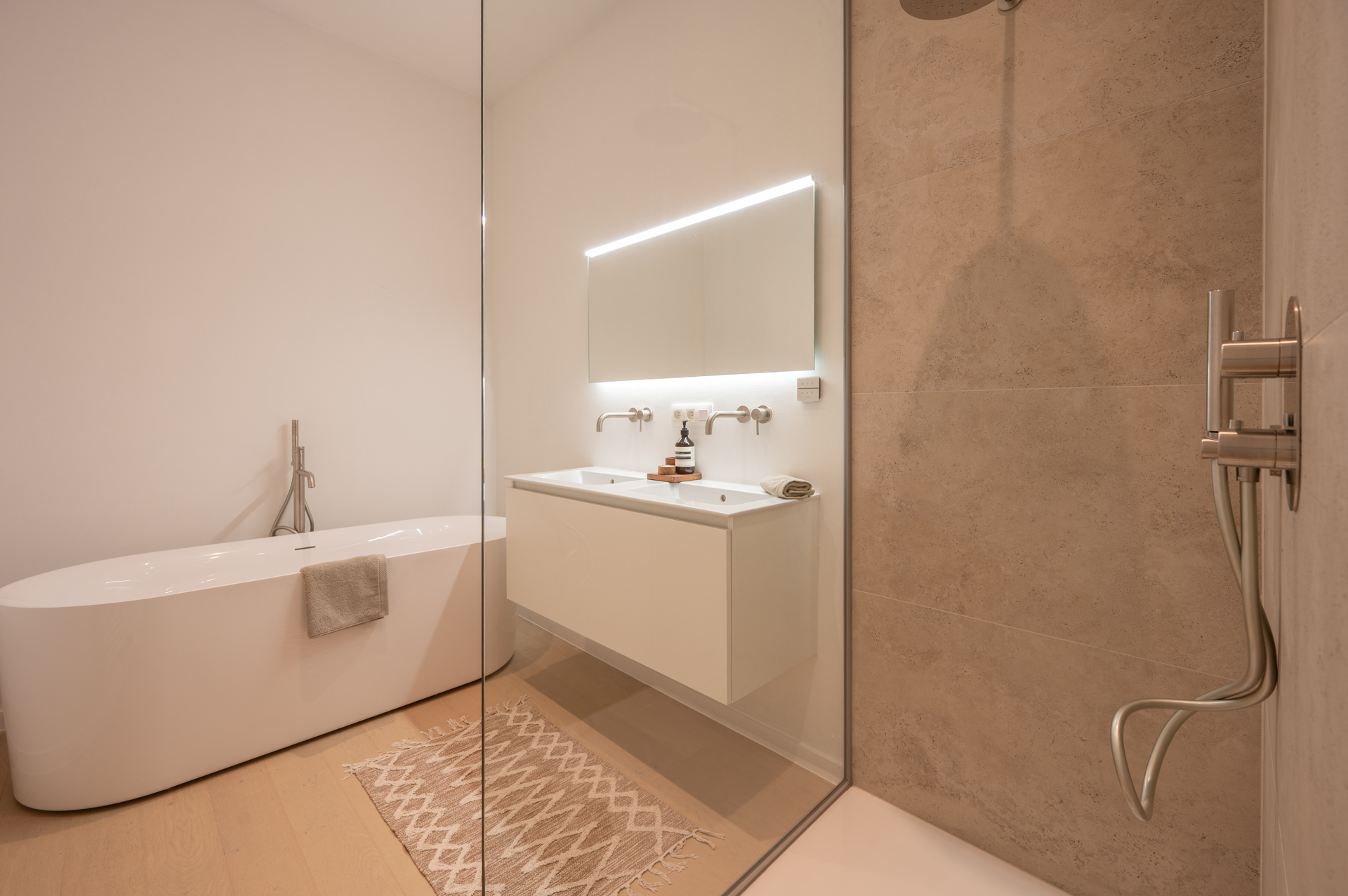 Er werd gekozen voor een strakke afwerking met een warme tint zoals parket en hout. De volledige woning werd tevens voorzien van inbouwspots en in de badkamers werden inbouwkranen voorzien in inox, voor een tijdloze afwerking.
