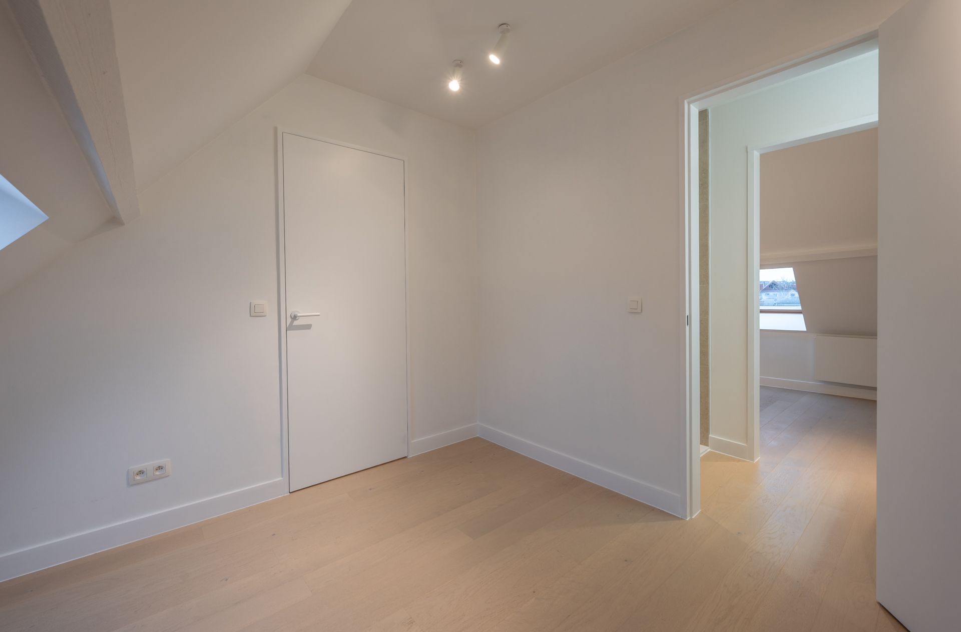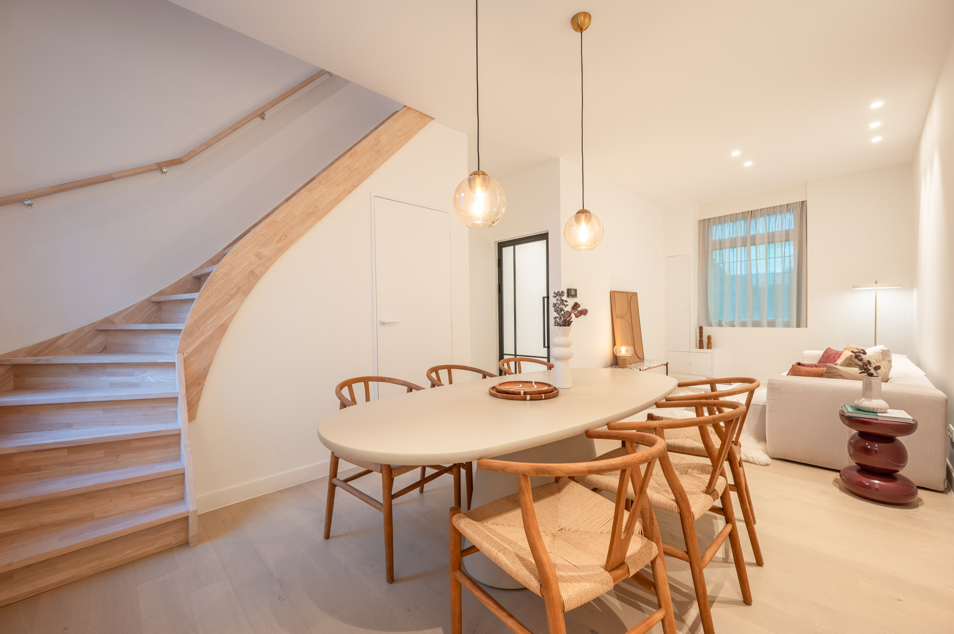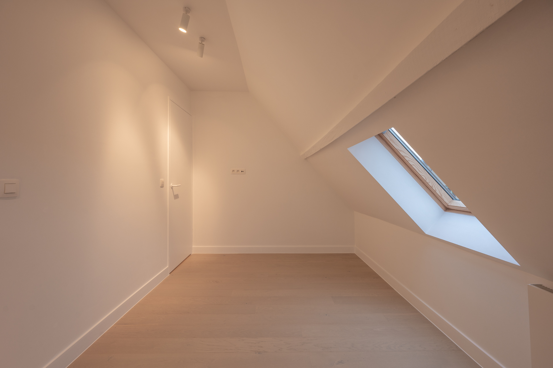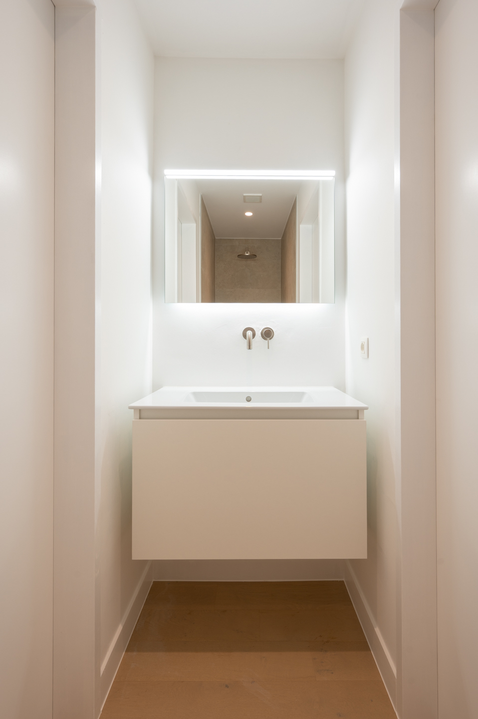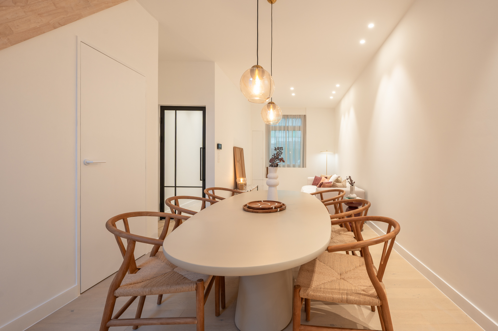 Er werd gekozen voor een strakke afwerking met een warme tint zoals parket en hout. De volledige woning werd tevens voorzien van inbouwspots en in de badkamers werden inbouwkranen voorzien in inox, voor een tijdloze afwerking.