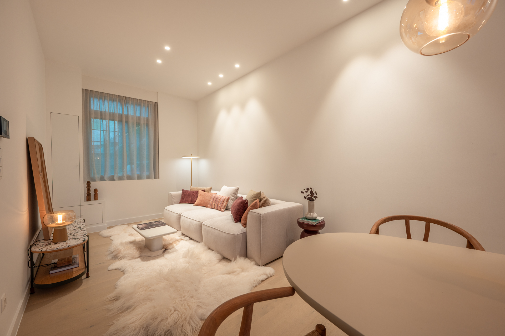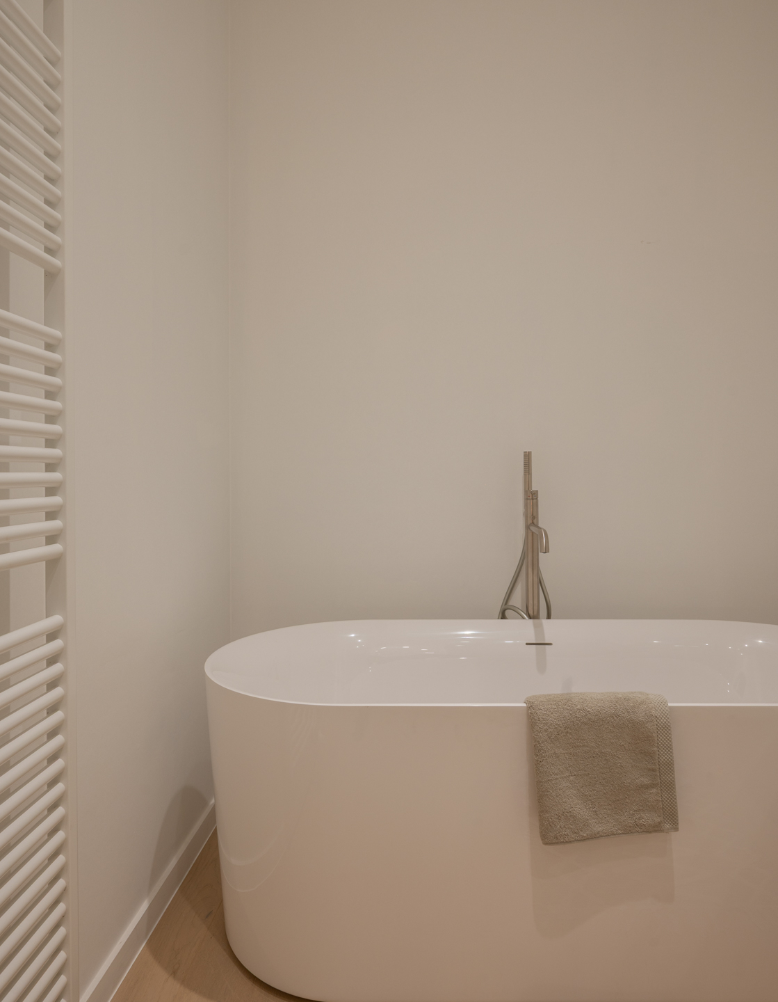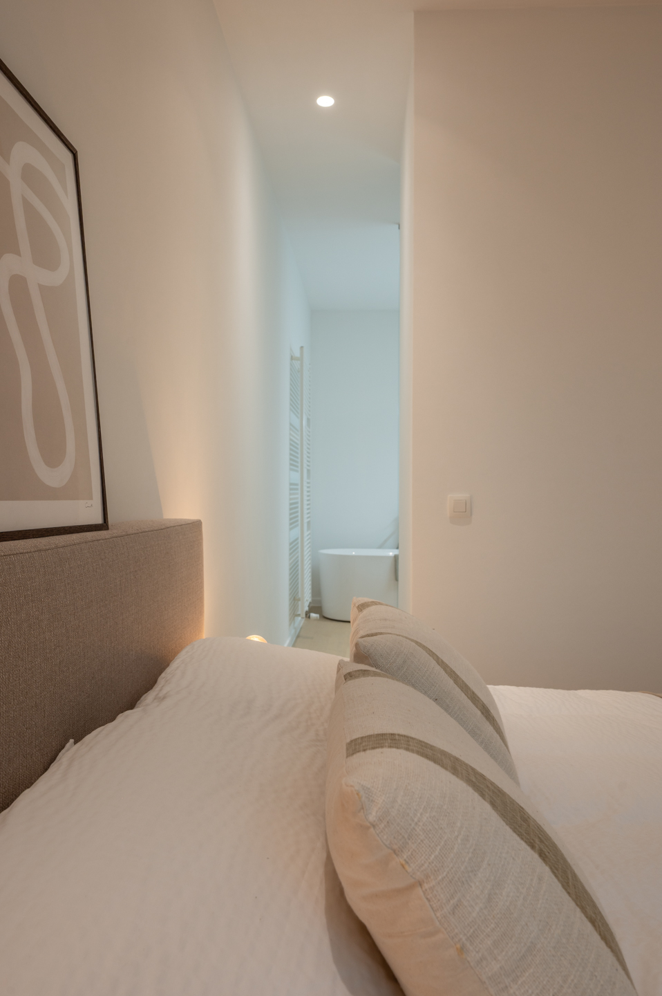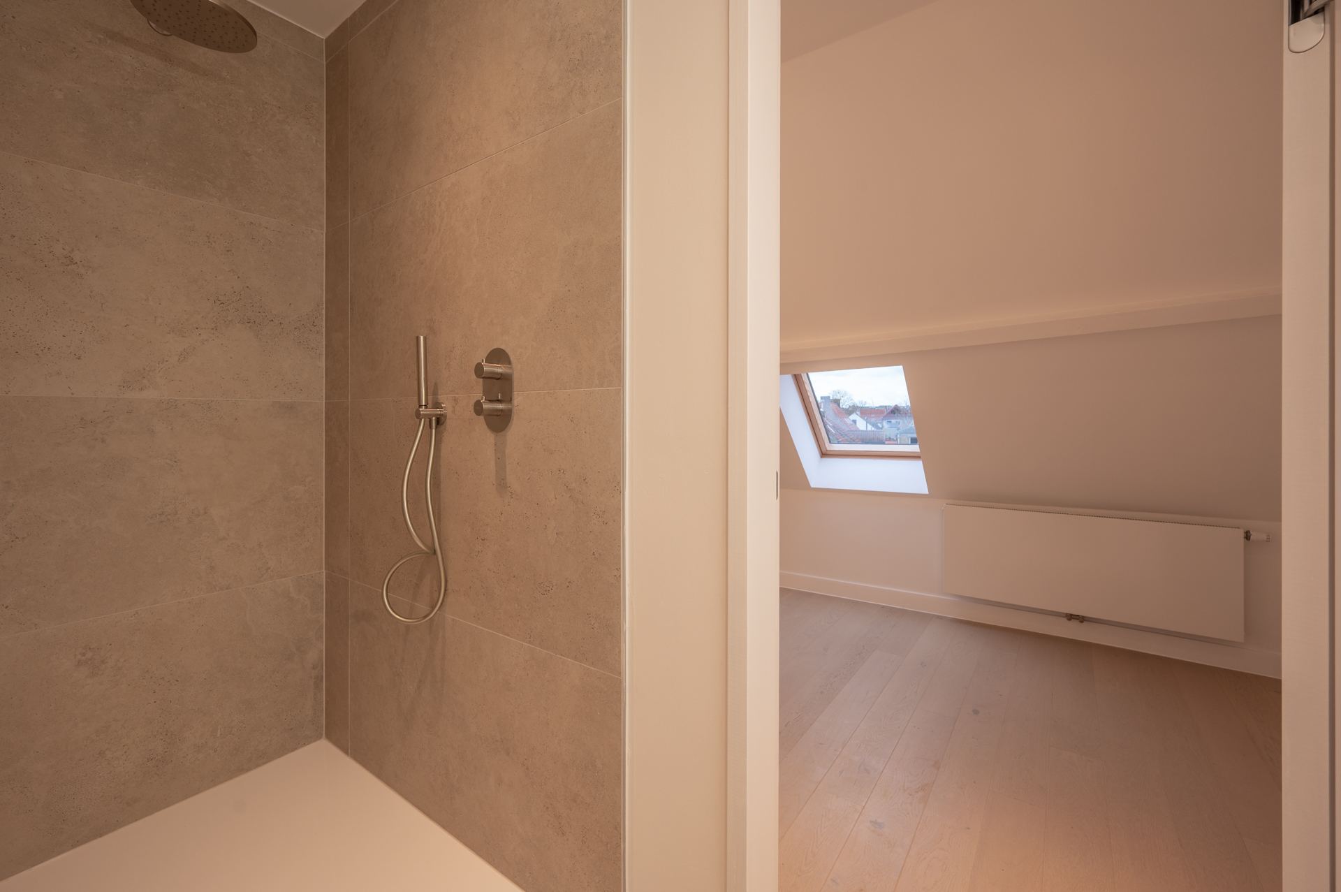 Er werd gekozen voor een strakke afwerking met een warme tint zoals parket en hout. De volledige woning werd tevens voorzien van inbouwspots en in de badkamers werden inbouwkranen voorzien in inox, voor een tijdloze afwerking.
