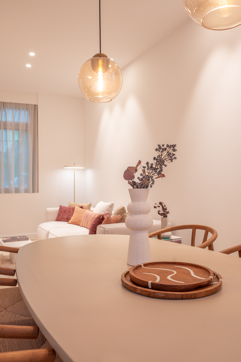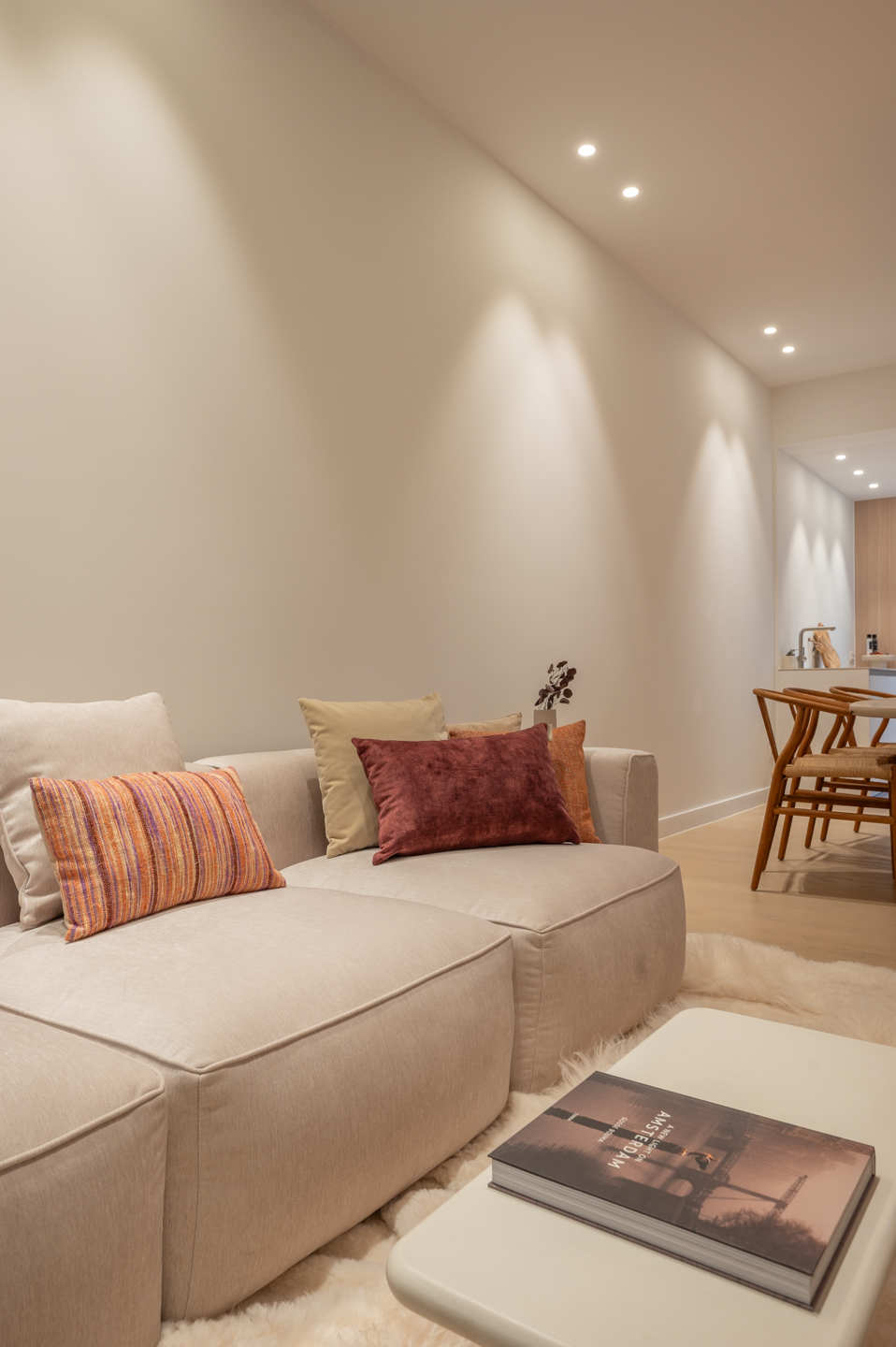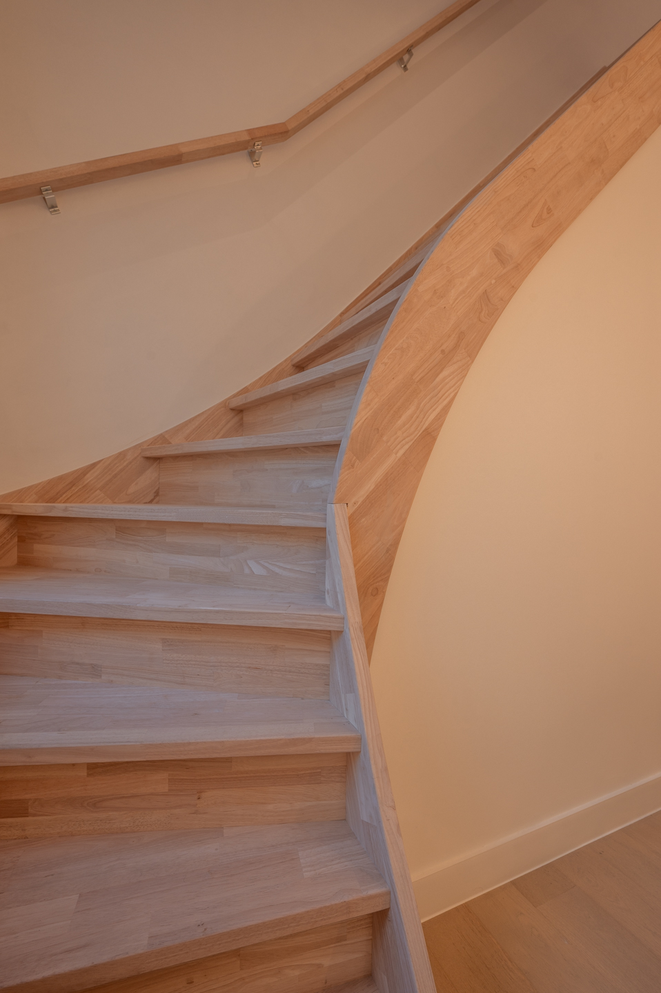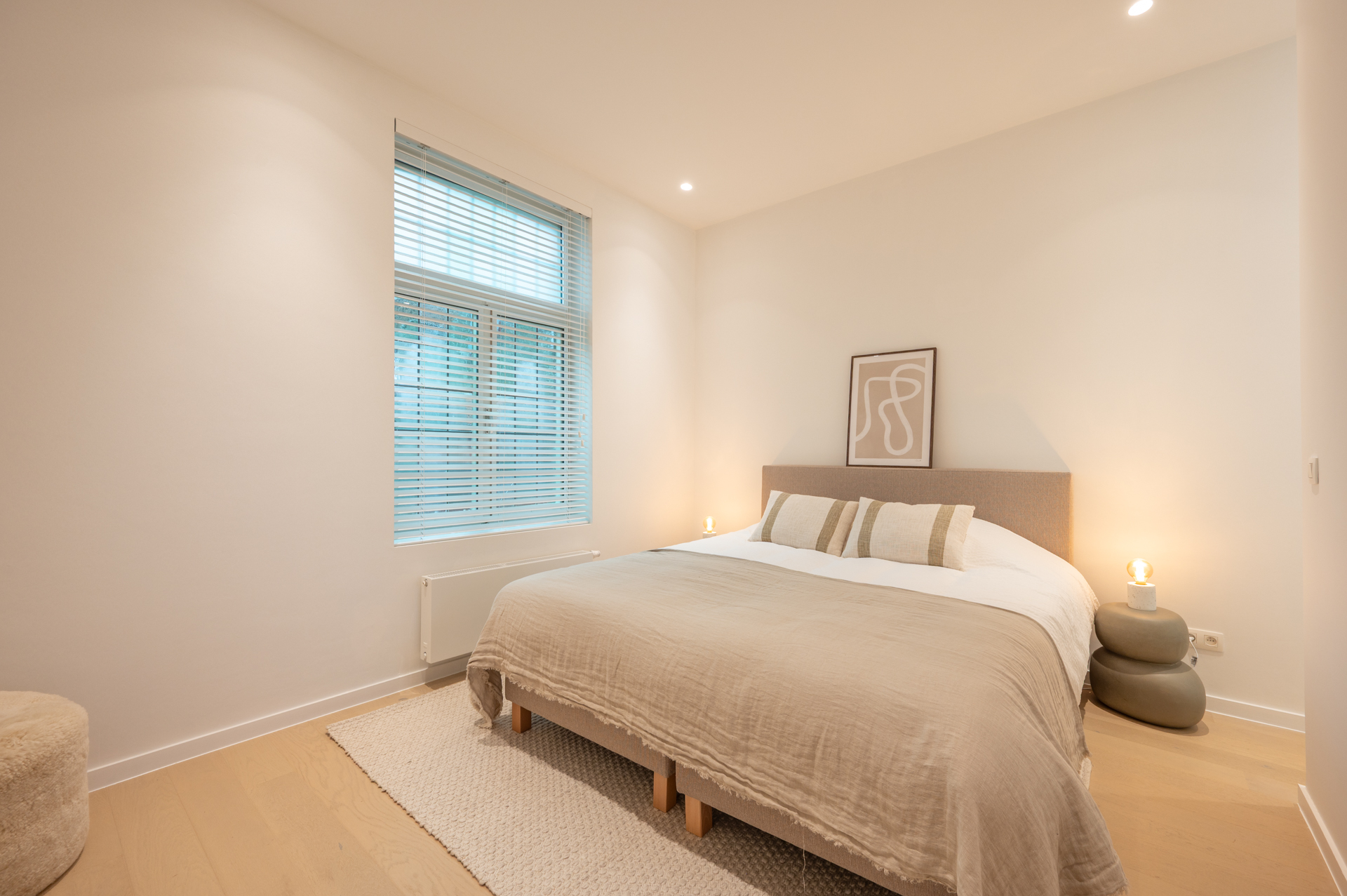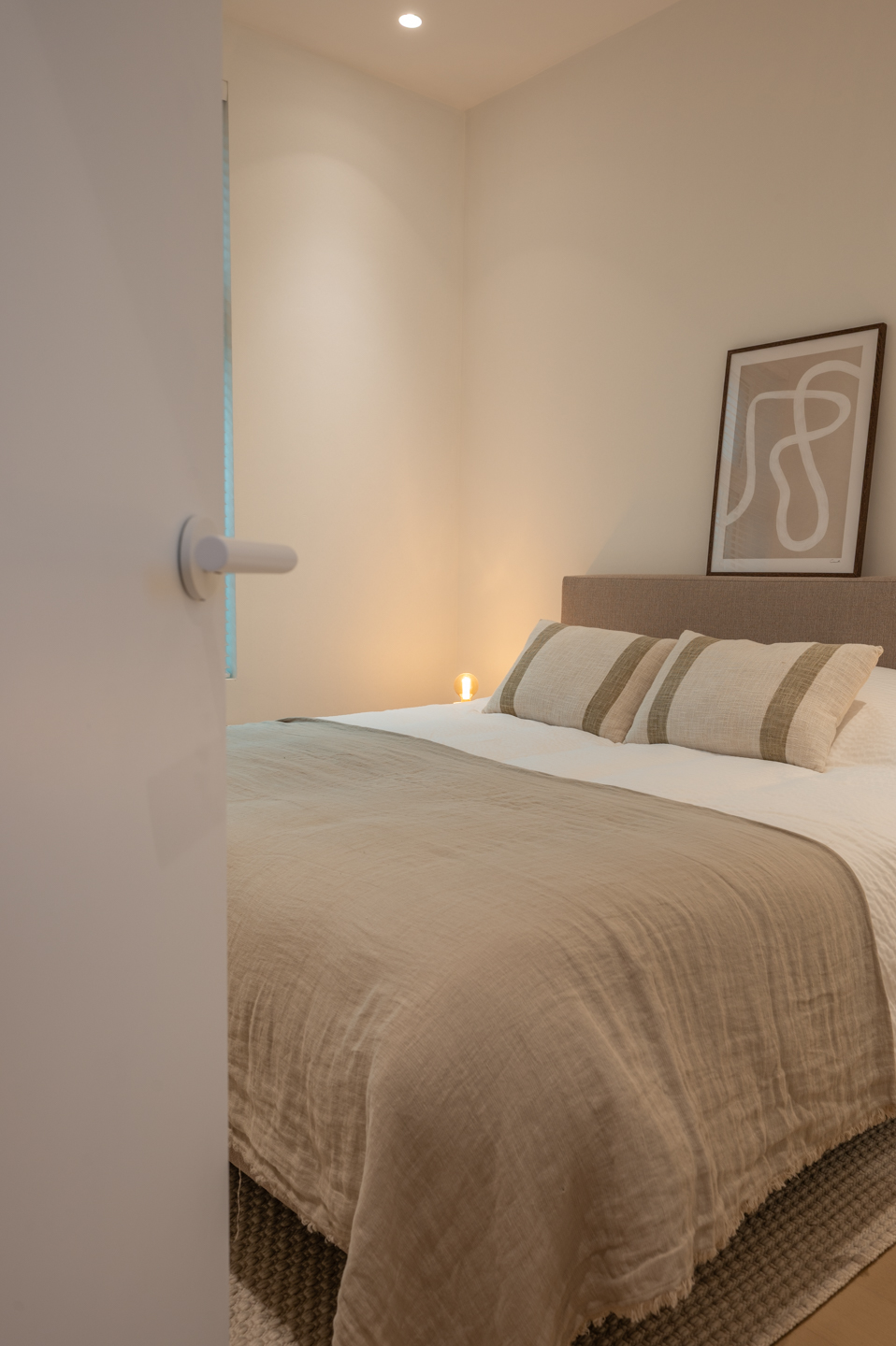 Er werd gekozen voor een strakke afwerking met een warme tint zoals parket en hout. De volledige woning werd tevens voorzien van inbouwspots en in de badkamers werden inbouwkranen voorzien in inox, voor een tijdloze afwerking.