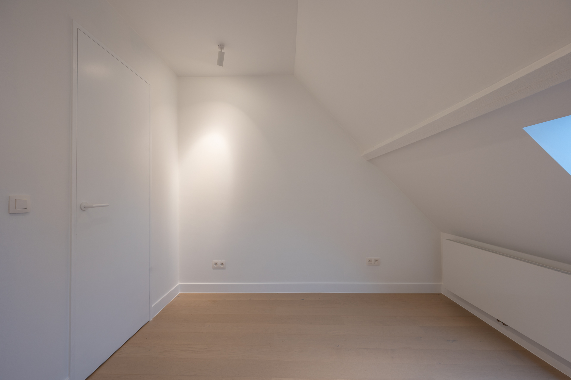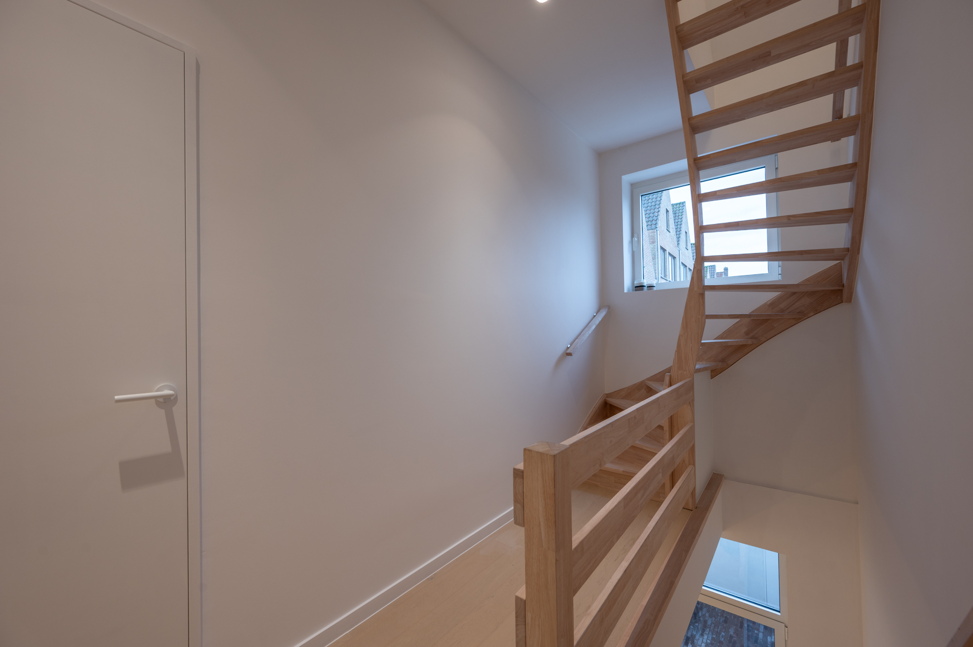Op het gelijkvloers hebben we een ruime leefruimte met open keuken die uitkijkt op het aangenaam stadsterras, apart toilet en berging. Via de trap komen we in de lichtrijke nachthal op de eerste verdieping met afzonderlijk toilet, de rest van deze verdieping werd gebruikt als master bedroom met open badkamer. Op de tweede verdieping werden 2 ruime slaapkamers gecreëerd met een gedeelde douchekamer. Hierboven werd nog een zolder gemaakt die gebruikt kan worden voor extra stockage.